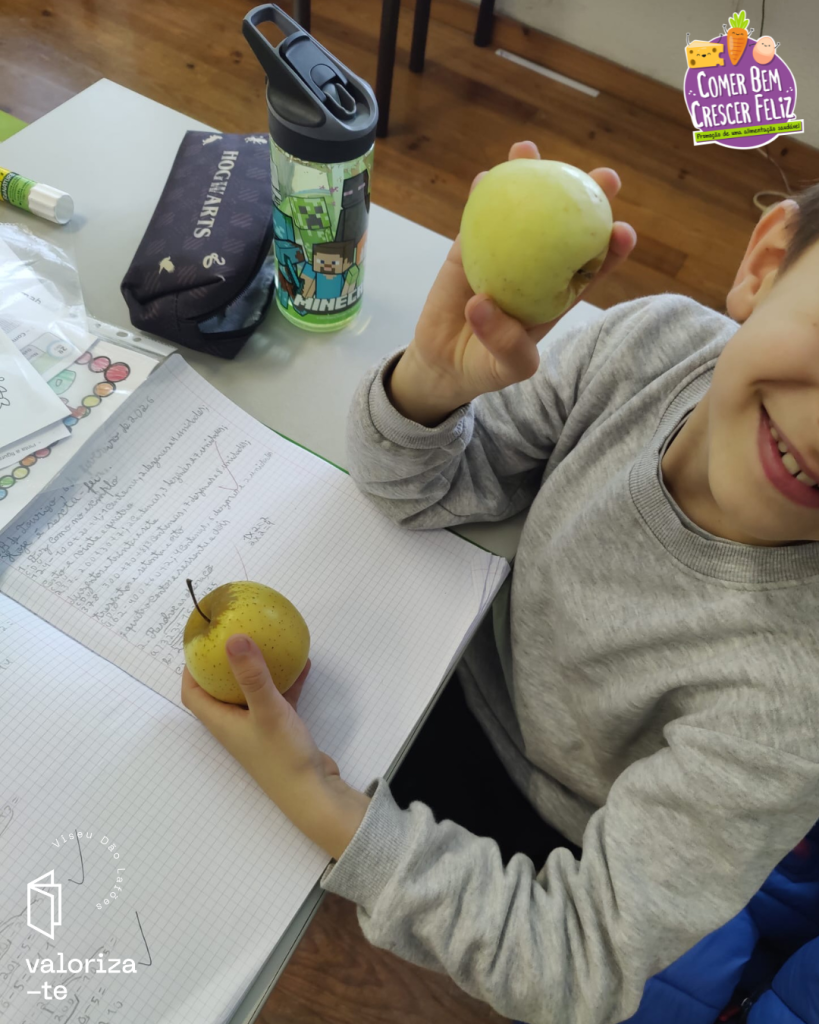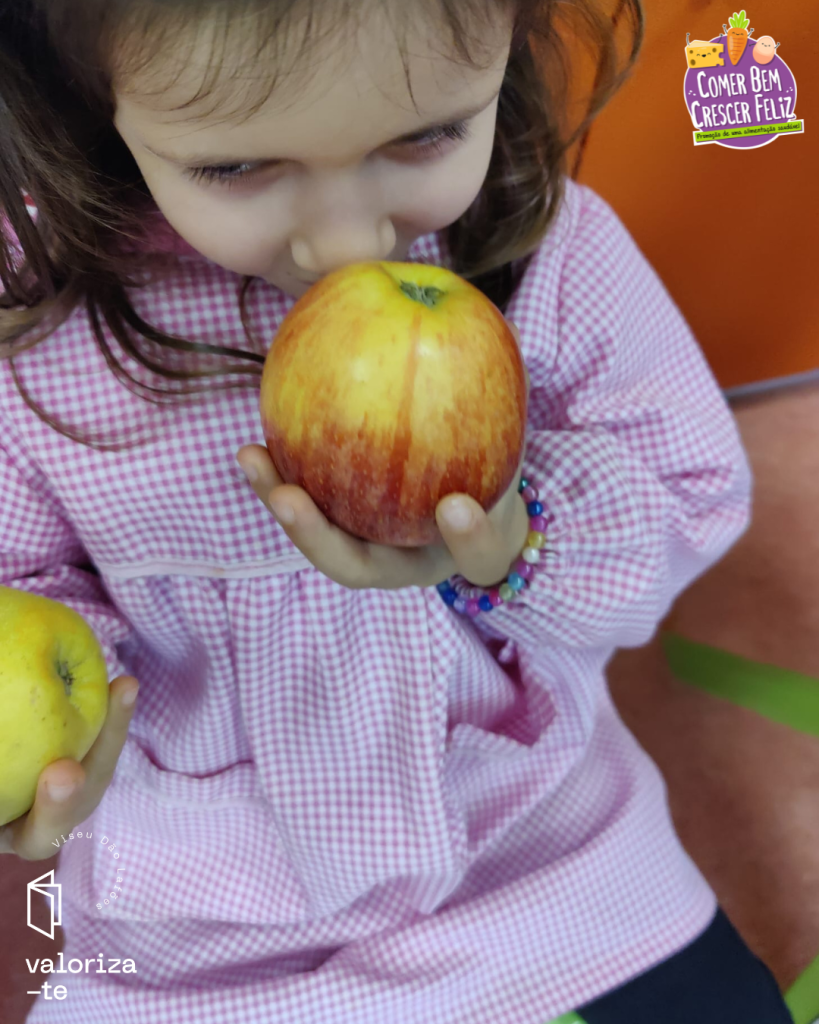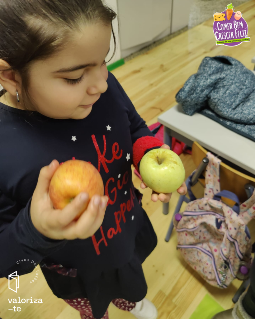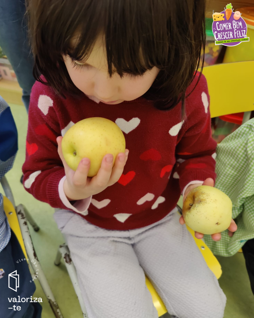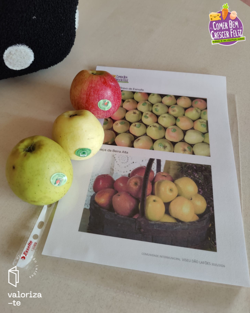 Nestes dias, as crianças conheceram a maçã da Beira Alta e a maçã Bravo de Esmolfe, reconhecendo os seus selos de qualidade (IGP e DOP), e reforçando a aprendizagem sobre produtos cultivados e produzidos na região de Viseu Dão Lafões.