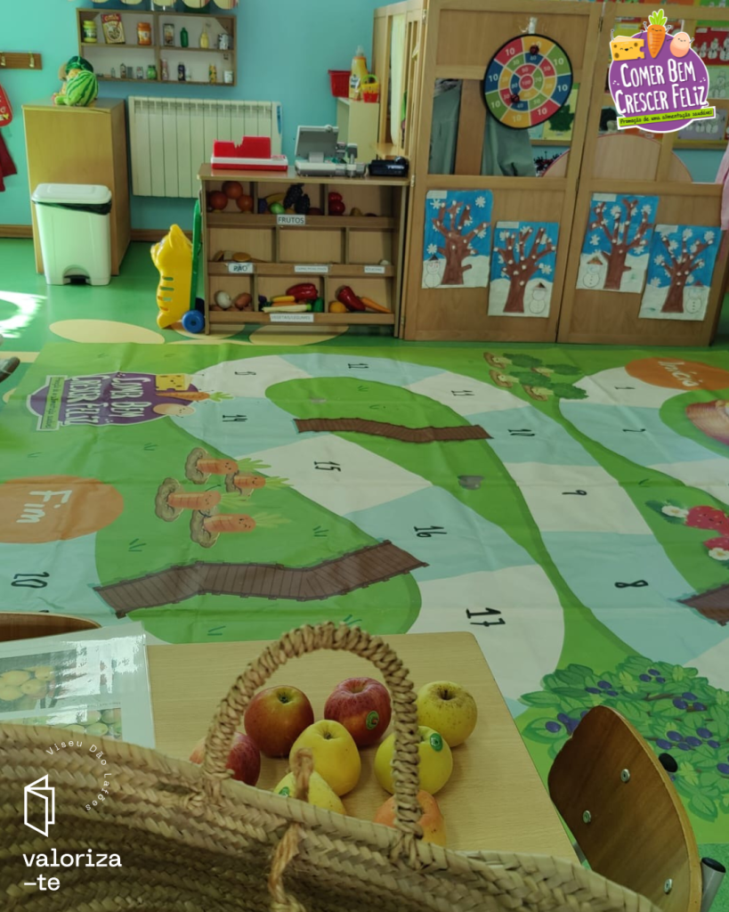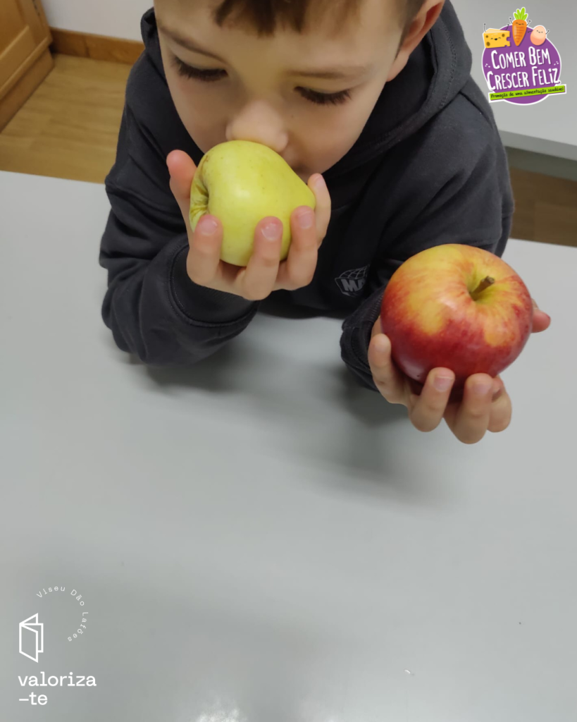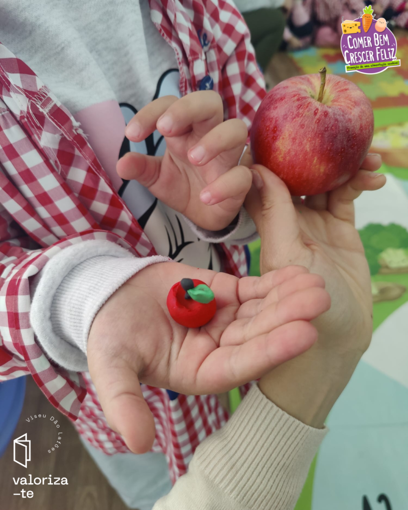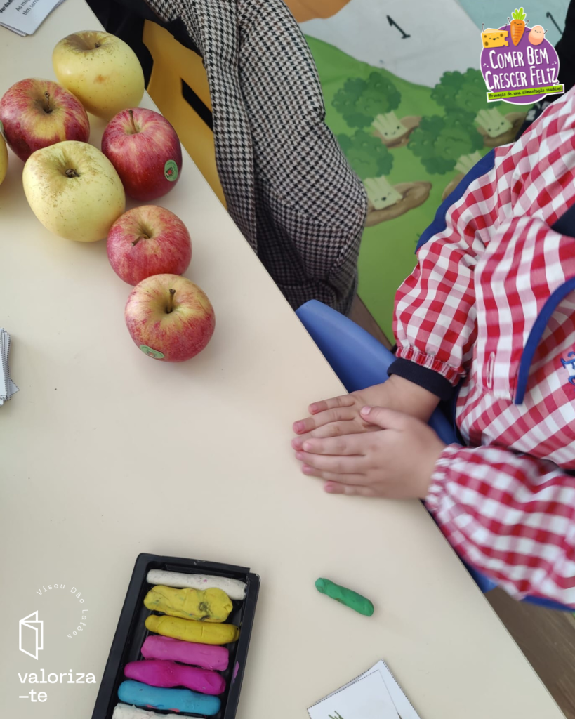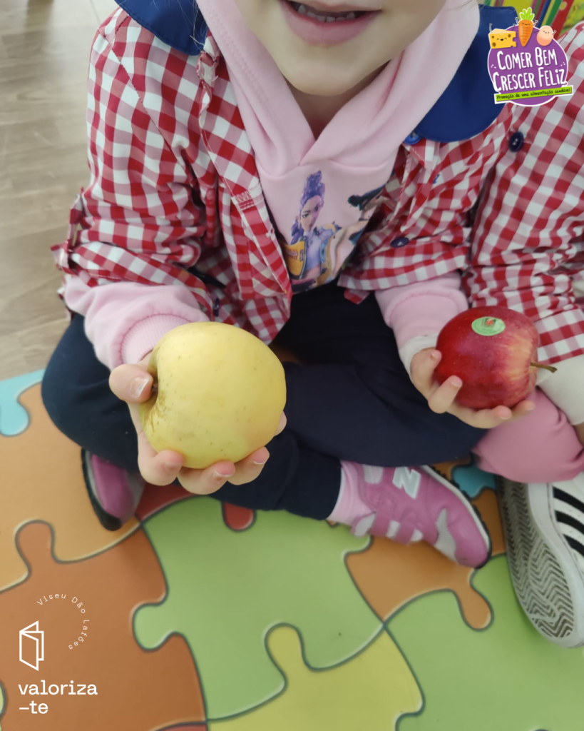 Nestes dias, as crianças exploraram a maçã da Beira Alta e a maçã Bravo de Esmolfe, reconhecendo os respetivos selos de qualidade (IGP e DOP) e reforçando aprendizagem sobre produtos cultivados e produzidos na região de Viseu Dão Lafões.